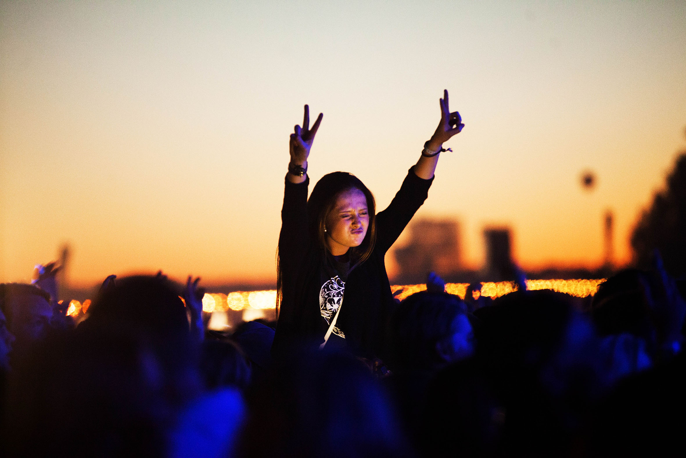 Festivalbesökare i solnedgång, Bråvalla festival 2014.
